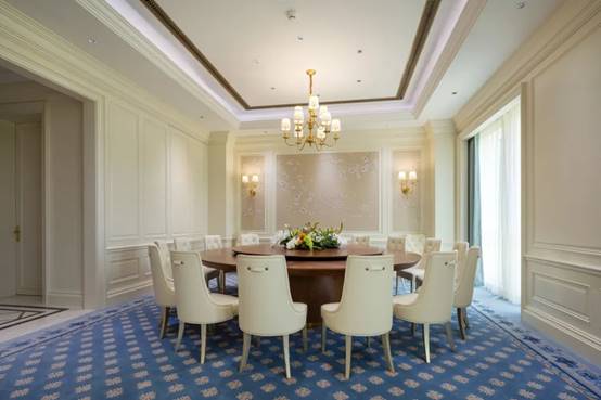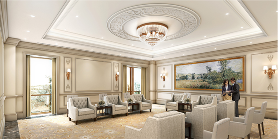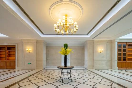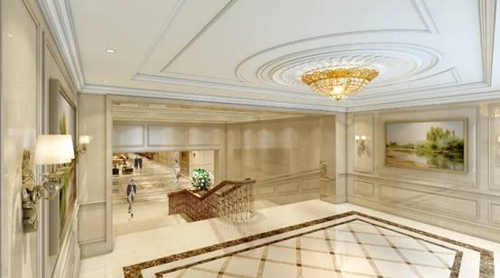 室内设计以欧式+现代相结合风格为主。地面主要采用大理石、地毯、瓷砖等材料突显简约大气;墙面采用的是GRG、木饰面以及大理石彰显奢华;顶面则以乳胶漆饰面、铝方通、铝板等材料,整体装饰在简洁的同时将精致表现在每处角落。
