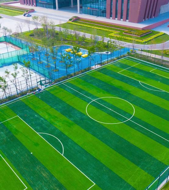 主体建筑南侧为中国梦广场,该运动主题广场,呼应全民健身主题,设有足球场、篮球场、网球场、蓝色塑胶跑道等专项运动场地,满足市民健身的多重需求。场地内部结合运动主题,以彩色地坪、花卉等景观色彩,软化建筑线条感。