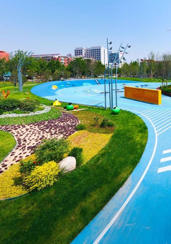 市民公园顺应场地坡度,设计浅色景观环,环内园路镌刻劳模脚印,象征着“新时代的美好生活是由劳动人民一步一步走出来的”。园内以寓意星辰大海的蓝色为主色调,设置儿童活动区、休息娱乐区、户外健身区等。环形绿道包围串联各活动区间,为市民提供休闲娱乐的好去处。