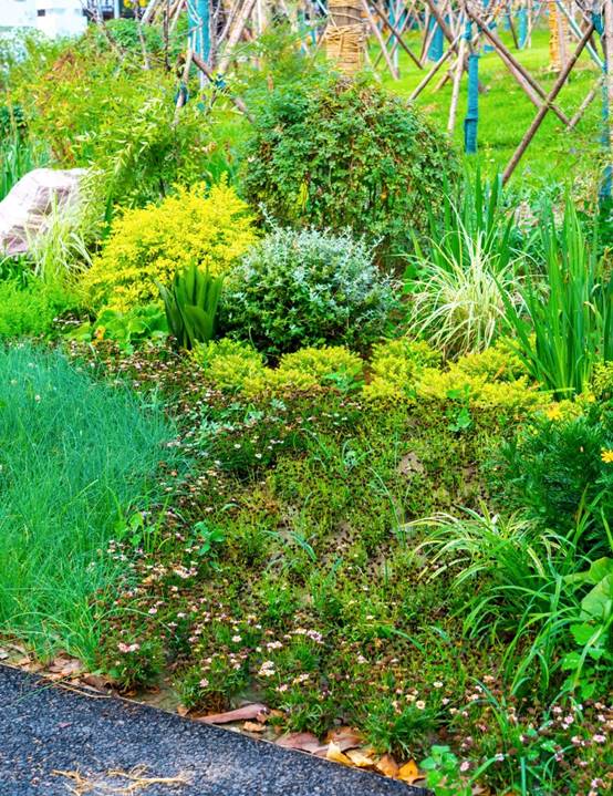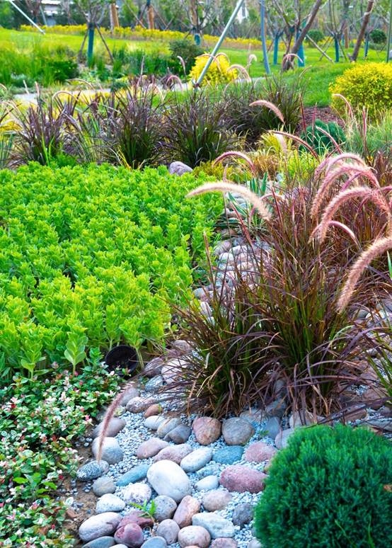 为提升人均绿化面积,项目在硬质广场周边规划疏林草地、种植树阵等软景。选植不同季相、不同色彩的植物,适地适树,搭建乔灌藤草立体植物群落,达到三季有花、四季常青的景观绿化效果。