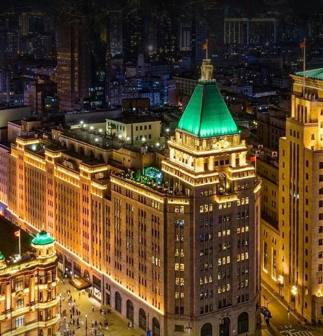 the Fairmont Peace Hotel is distinguished by its dark green copper pyramid.