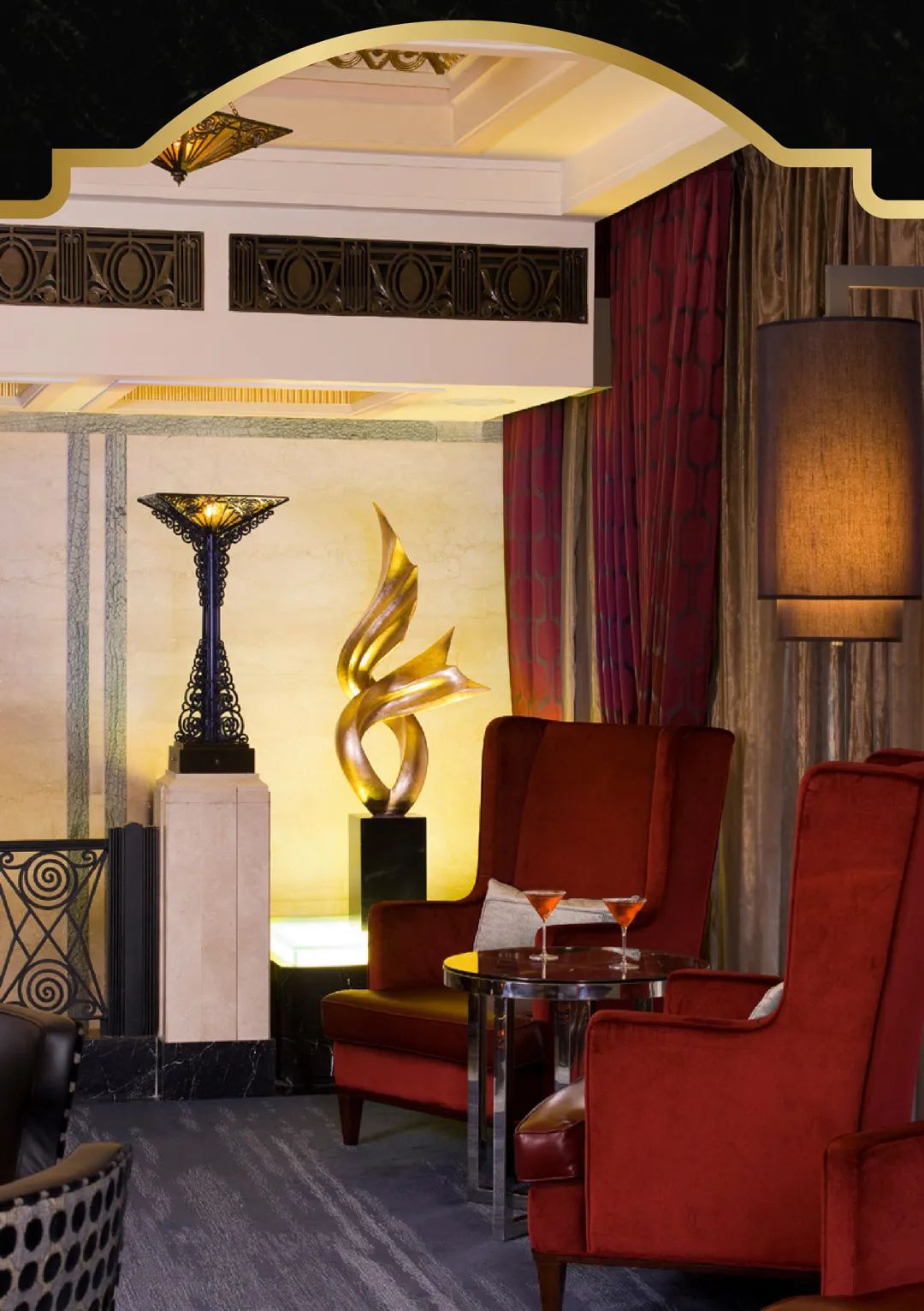 and mingling through its rich Art Deco style. Pictures of red velvet high-backed single chairs,