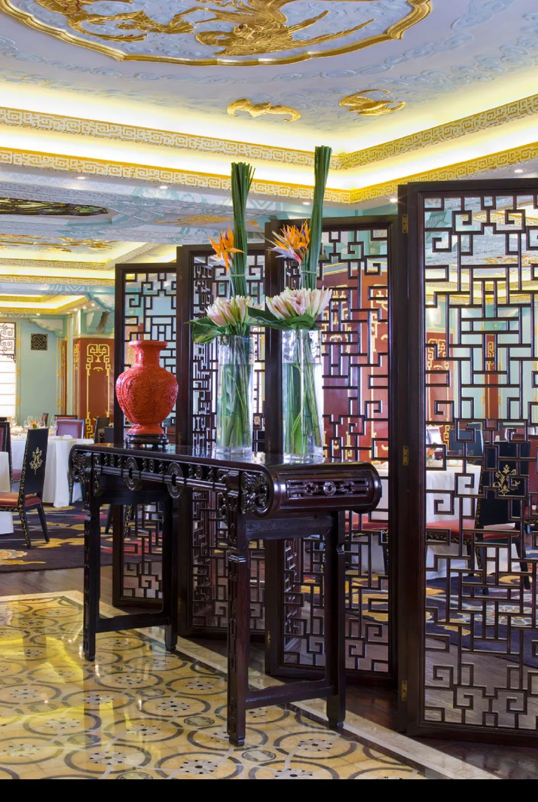The lavishly ornamented space boasts magnificent traditional Chinese elements,
