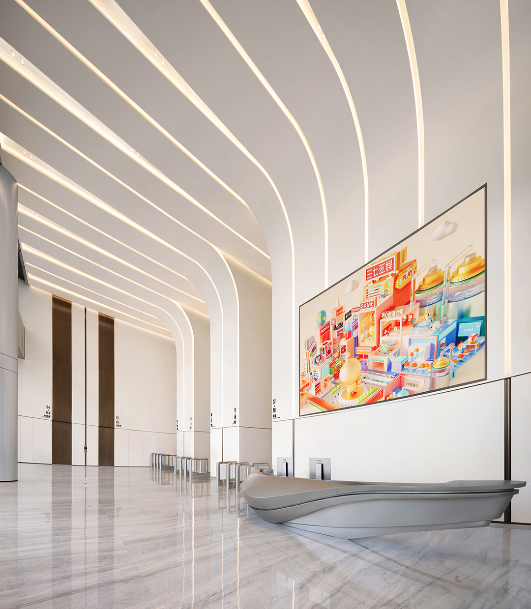 建筑外观采用「7字板」造型,设计灵感来自三七互娱iCON,呼应“三七互娱”的特点