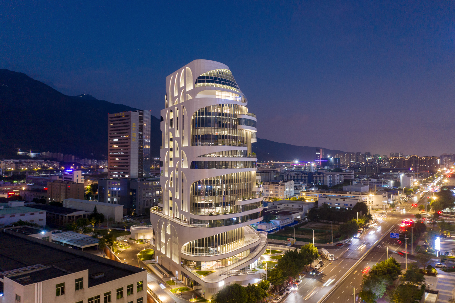 一座造型别具一格的建筑正拔地而起, 仿佛一座绿意葱茏的梦幻“空中花园”