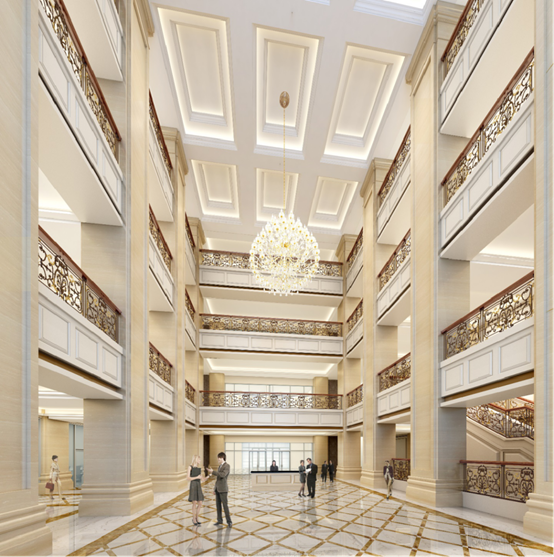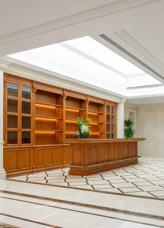 室内设计以欧式+现代相结合风格为主。地面主要采用大理石、地毯、瓷砖等材料突显简约大气;墙面采用的是GRG、木饰面以及大理石彰显奢华;顶面则以乳胶漆饰面、铝方通、铝板等材料,整体装饰在简洁的同时将精致表现在每处角落。