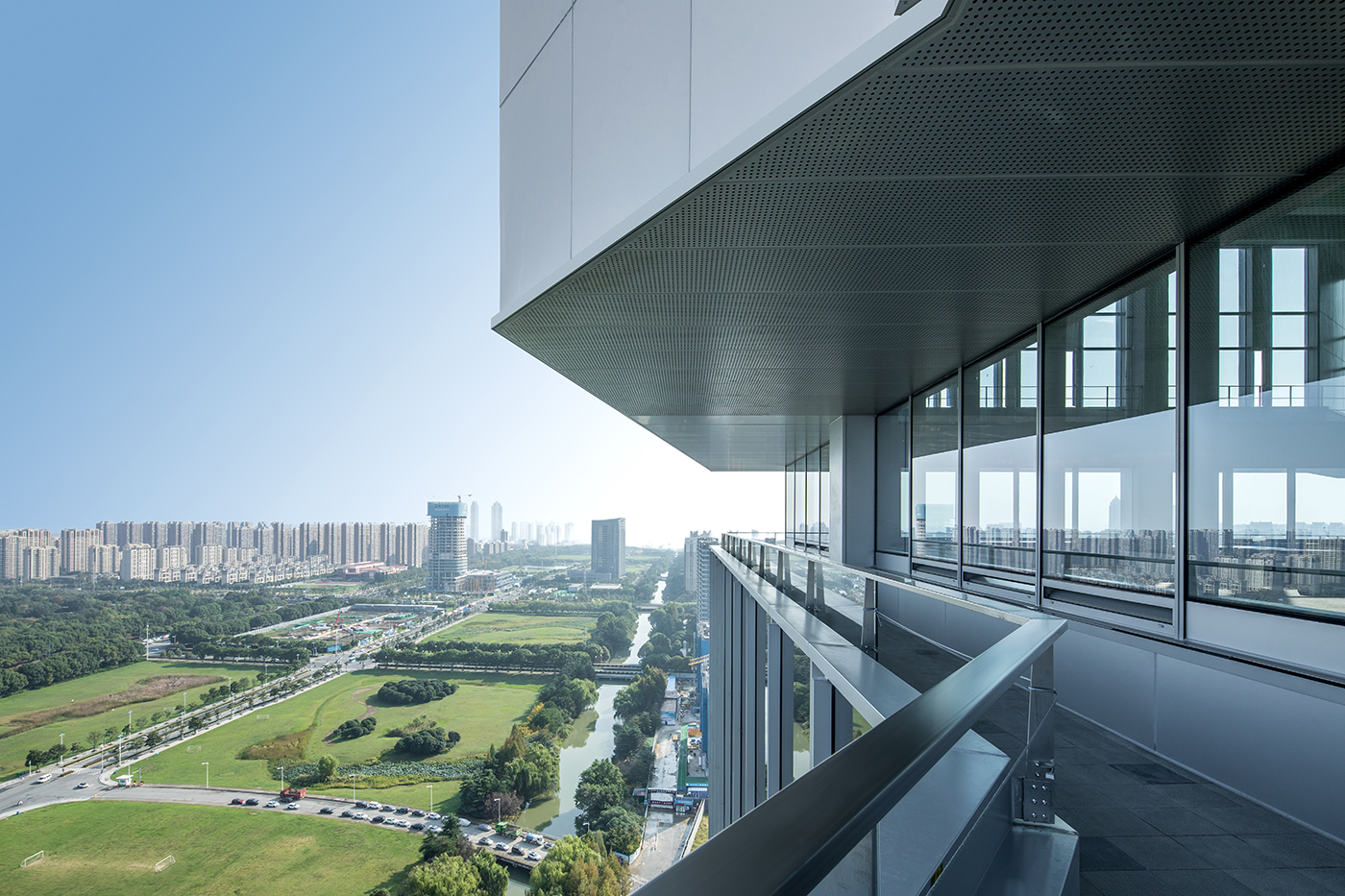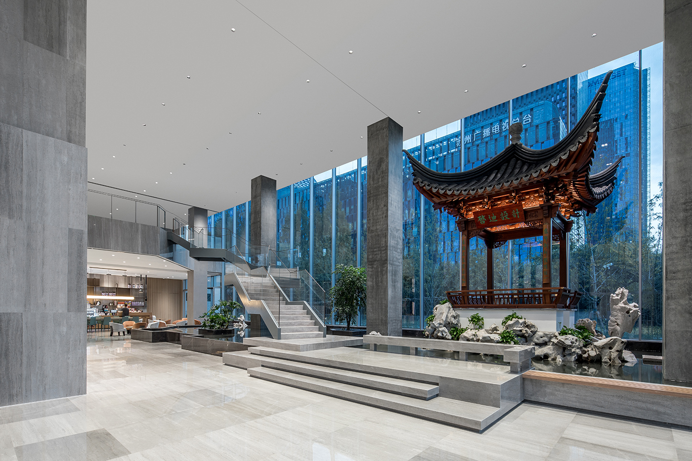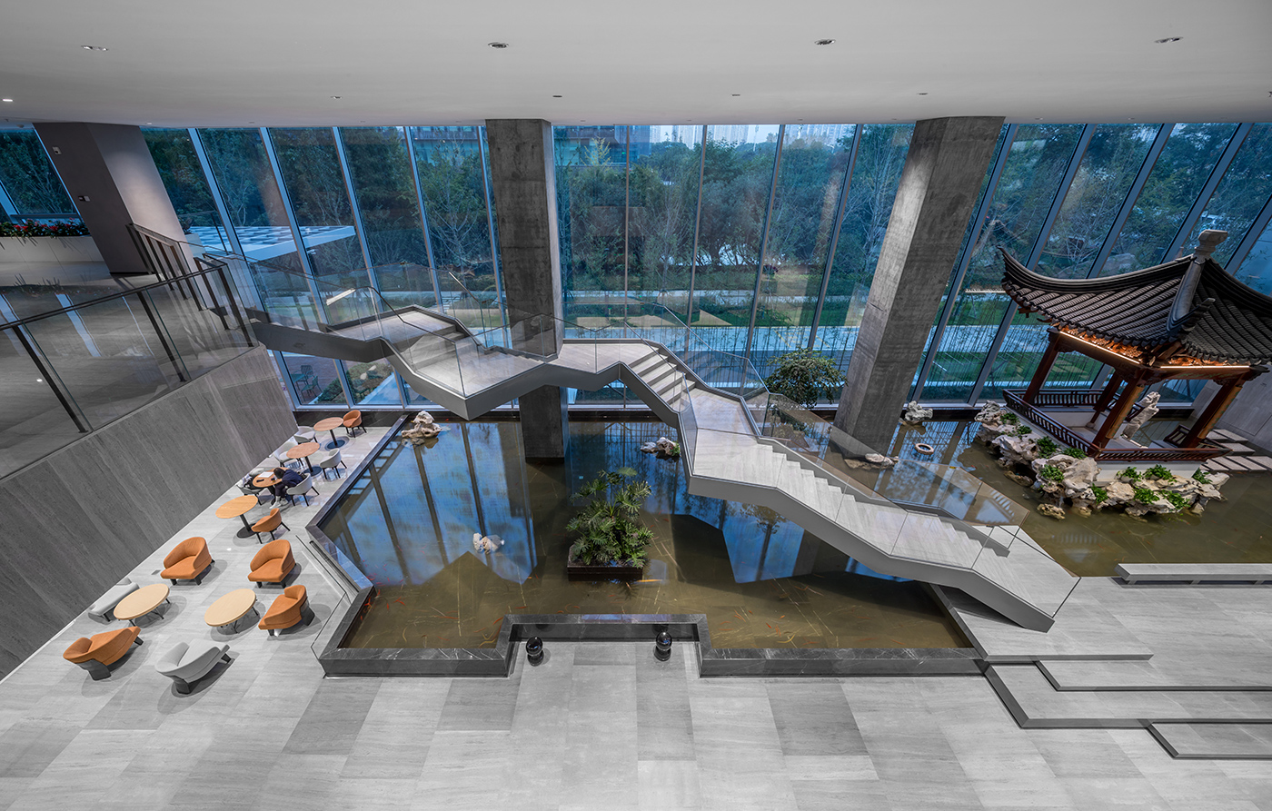 大厦不仅仅是一座办公楼,更是一座承载着历史与文化的艺术殿堂。每一个幕墙板块都像一件艺术品,流畅的线条、斑斓的色彩,犹如水墨画中的笔触,为这座建筑赋予了典雅而高贵的灵魂。大厦塔楼每四层创造一个垂直院落,仿佛是苏州民居中一进进的院落在垂直方向上的现代演绎;每四层一圈外廊形成空中环廊,宛如苏州园林中的“廊”,将人与自然完美融合。垂直院落与空中环廊共同构成观景最美中轴线,让人在城市的繁华中领略到苏州园林的绝佳视角。下沉庭院及光导管的空间布局,使得办公区域采光系数得到提升,有效改善了室内自然采光条件。南北双庭院和裙房屋面光导管及天窗的构思,更是在满足功能需求的同时,将苏州传统园林的美学发挥得淋漓尽致。
