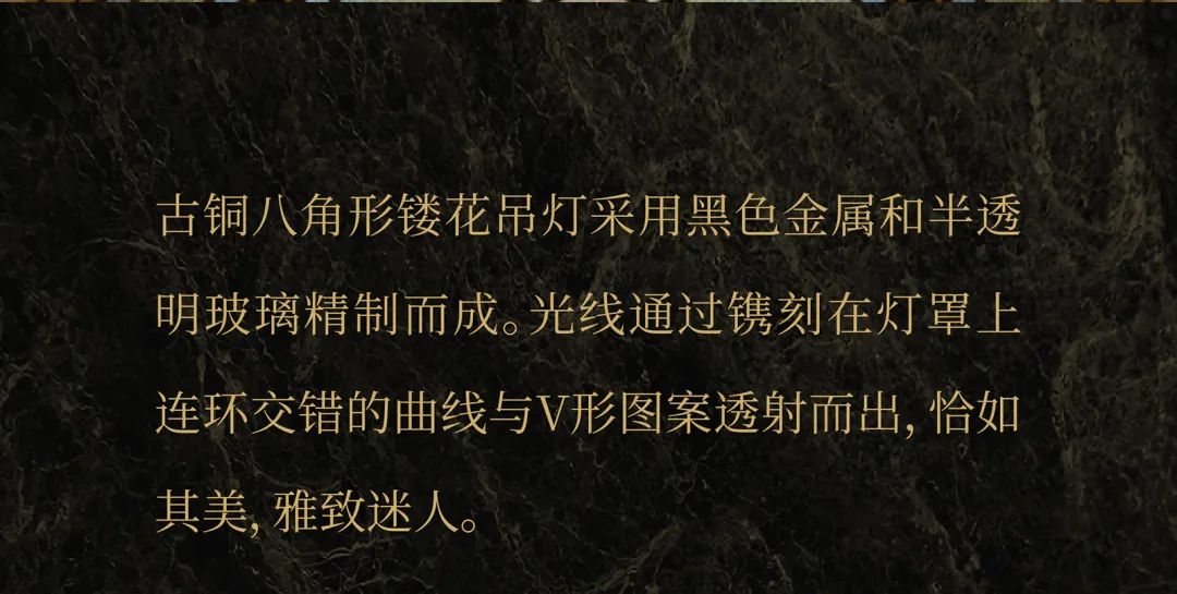 The antique brass octagonal carved chandelier is carefully crafted from black metal and translucent glass.