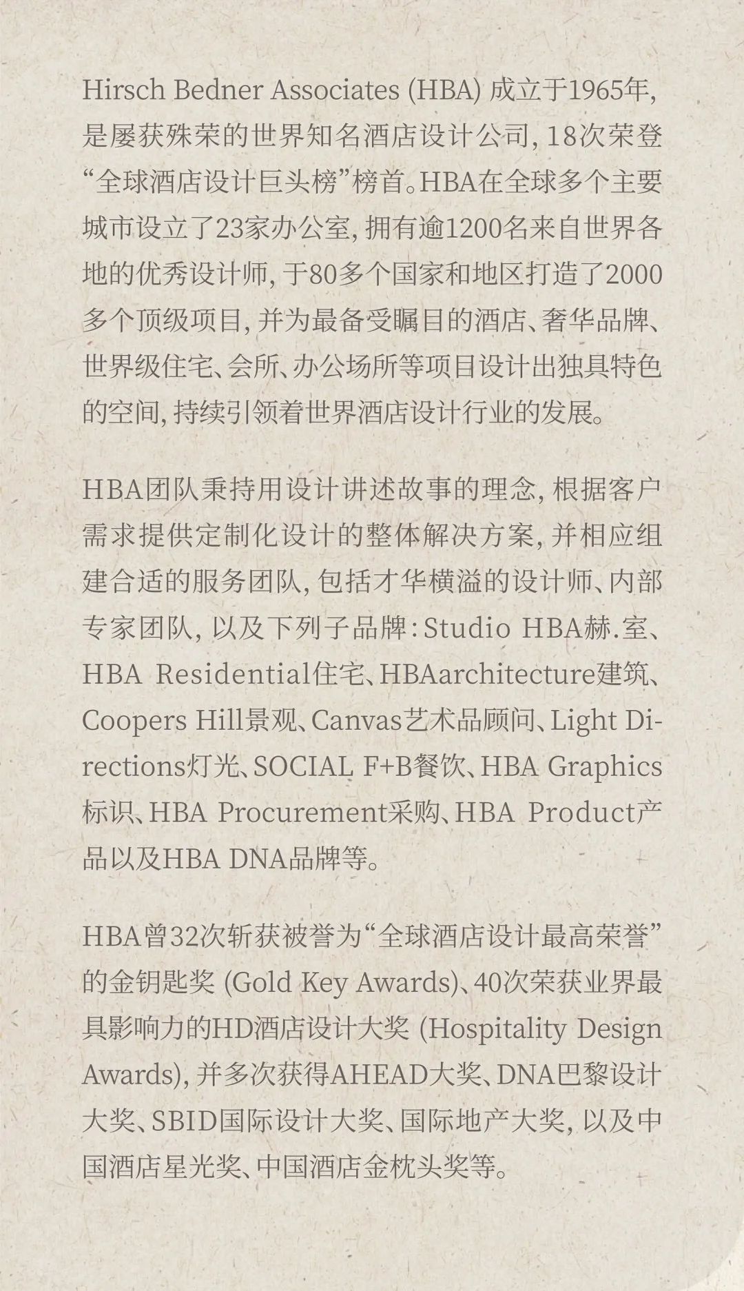 Founded in 1965, Hirsch Bedner Associates (HBA) is an award-winning, world-renowned hospitality design firm that has topped the "Global Hospitality Giants" list 18 times. With 23 offices in major cities worldwide and over 1,200 excellent designers from around the globe, HBA has created more than 2,000 top-quality projects in over 80 countries and regions. HBA continues to lead the development of the world's hospitality design industry by designing distinctive spaces for the most high-profile hotels, luxury brands, world-class residences, clubs, offices, and other projects.