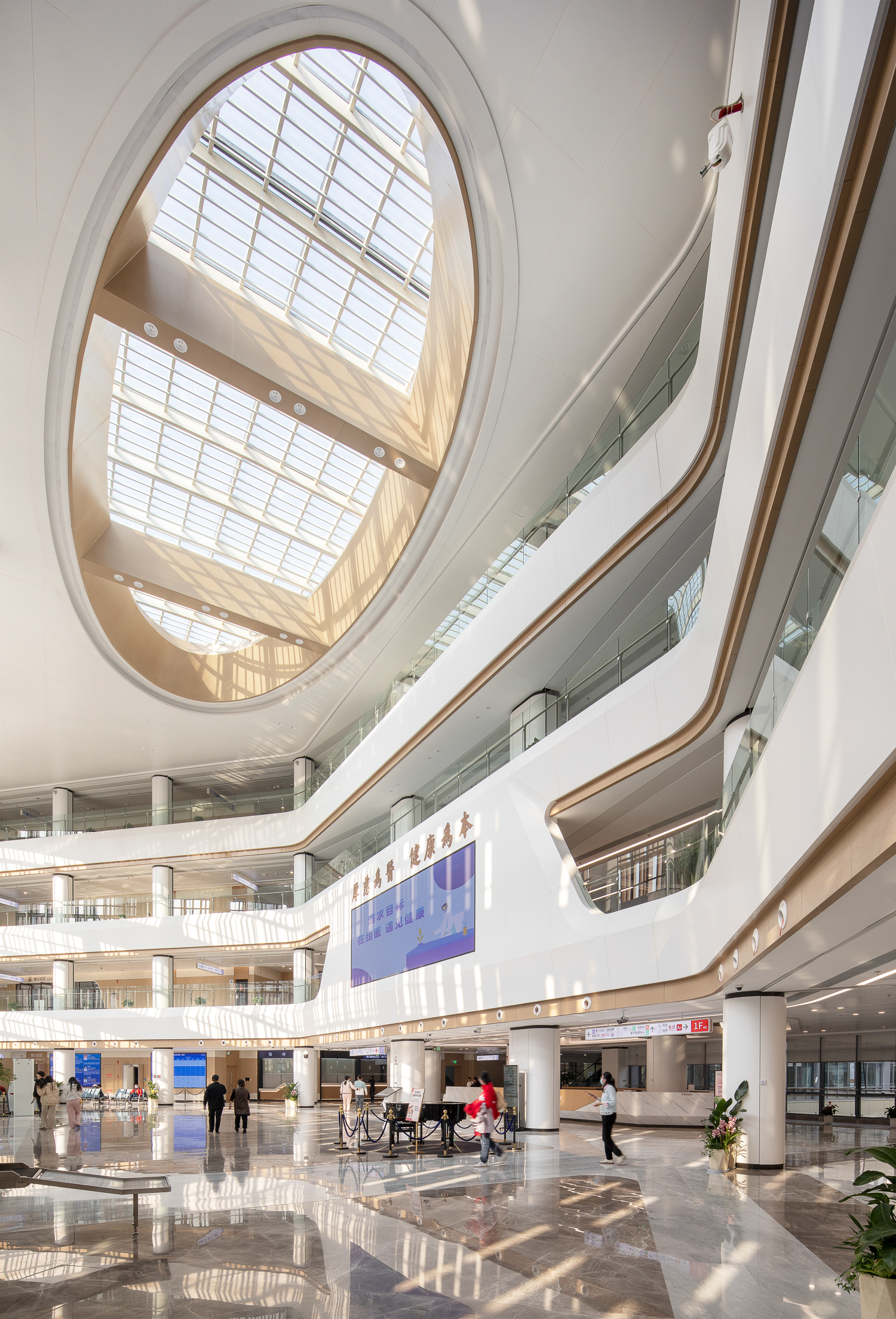 项目总建筑面积达 26 万平方米,分为 A、B 两区块,之间以一座壮观的桥梁相连,犹如一条纽带将两个区域紧密相连,展现出现代化医院的宏伟气势。医院以“园林式医院”为定位,巧妙地将绍兴的竹林、茶园、石桥等元素融入建筑肌理。漫步其中,让医疗空间成为传递城市文化的生动载体。